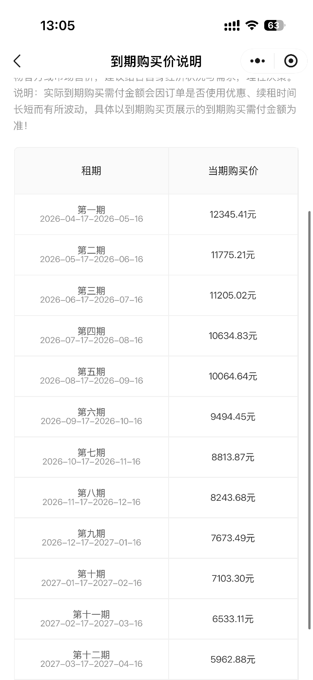 而实际的收费规则更为复杂。第一财经记者仍以市价1.09万元的手机进行测试。根据《租用服务协议》及平台披露信息,该产品租用一个月的租金为563元。若在首期即选择“买断”,则需支付买断费12345元,加上月租金合计12908元,远高于市场直接购买价。而若用户在租用后90天内提前中断租约,除已付租金无法退还外,多数情况下还需额外承担剩余租期租金18%至30%的违约金。以这款手机为例,仅违约金一项就高达2000元。